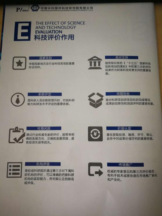 科技成果评价是指按照委托者的要求,由评价机构聘请同行专家,坚持实事求是、科学民主、客观公正、注重质量、讲求实效的原则,依照规定的程序和标准,对被评价科技成果进行审查与辨别,对其科学性、创造性、先进性、可行性和应用前景等进行评价,并做出相应结论。对成果的知识产权不做评价。